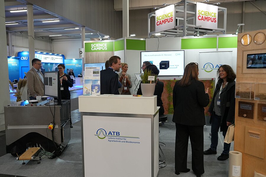 In Halle 24 der Agritechnica präsentierte das ATB an einem gemeinsamen Stand mit dem Bereich Landtechnik der Martin-Luther-Universität Halle-Wittenberg aktuelle Forschungsarbeiten von Unkrautrobotik über Moorstrategien bis zu präziser Bodenbewirtschaftung: