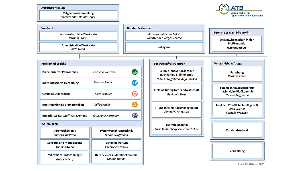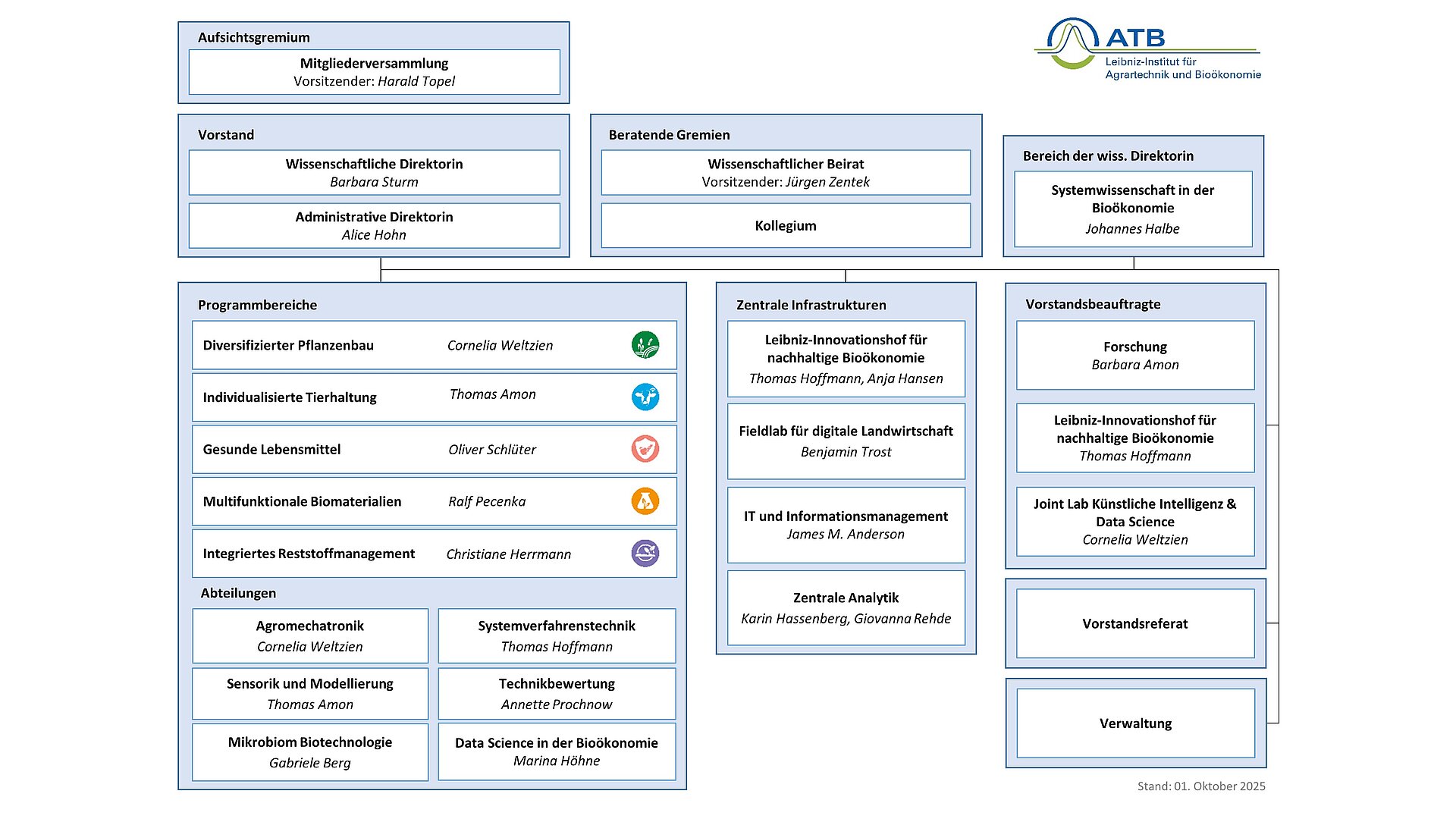 Das ATB ist ein Institut der Leibniz-Gemeinschaft mit der Rechtsform eines eingetragenen Vereins (e. V.). Rechtliche Grundlage der Arbeit des Instituts ist die Satzung des Vereins „Leibniz-Institut für Agrartechnik und Bioökonomie e.V. (ATB)“. Das ATB wird vom Land Brandenburg, der Gemeinschaft der Länder und der Bundesrepublik Deutschland institutionell gefördert.