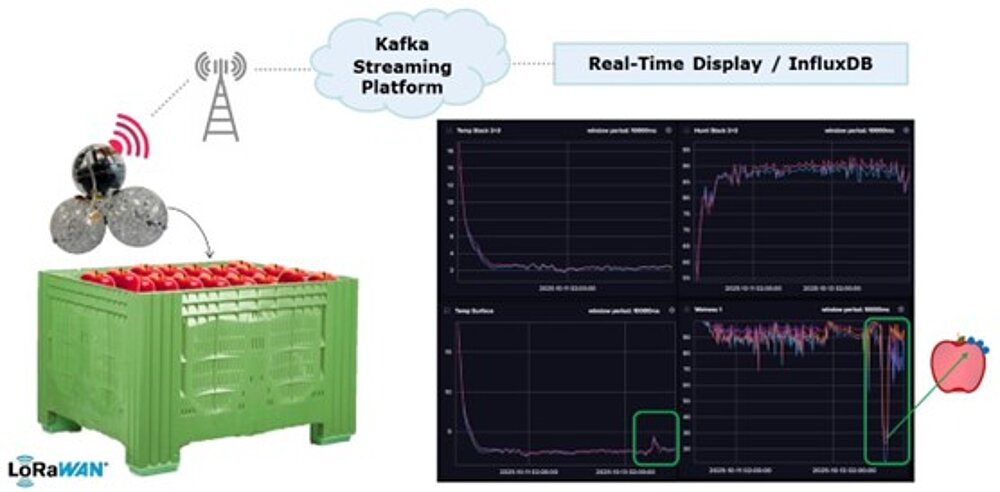 Wir entwickeln digitale Zwillinge für Apfelkühllager, die Sensordaten, Datenströme und Vorhersagemodelle kombinieren. Unser „Sensor-Twin“ in Apfelform wird direkt in die Obstmasse eingebracht, um Temperatur, Luftfeuchtigkeit, Gase und Oberflächenfeuchtigkeit auf Produktebene zu messen. Die Daten werden drahtlos (LoRa) übertragen und zur Echtzeitverarbeitung über digitale Plattformen (Kafka, InfluxDB) gestreamt. Der digitale Zwilling nutzt diese kontinuierlichen Daten zusammen mit Modellen zu Wärme-, Feuchtigkeits- und Gasaustausch, um das Kondensationsrisiko (Unterschreitung des Taupunkts) vorherzusagen und Hochrisikozonen innerhalb des Lagersystems zu identifizieren. Dies ermöglicht die Erkennung lokaler Kondensationsereignisse, die herkömmliche Sensoren auf Raumebene nicht erfassen können. Parallel dazu entwickeln wir einen modellbasierten digitalen Zwilling für die Ethylendynamik. Anstatt Ethylen überall direkt zu messen, kombiniert das System Sensordaten (Temperatur, O₂, CO₂, Luftstrom) mit Vorhersagemodellen, um Ethylenkonzentrationen und Reifeverlauf nahezu in Echtzeit abzuschätzen. Zusammen führen diese Ansätze das Kühlhausmanagement von der einfachen Überwachung hin zu datengestützter Vorhersage und Entscheidungsunterstützung. Die Integration dieser digitalen Zwillinge in Regelungsstrategien ist ein nächster Schritt, der eine automatisierte Optimierung der Lagerbedingungen ermöglicht.