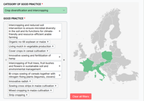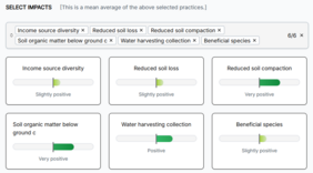 Insight into the Soil-X-Change dashboard with the selection options in the practice explorer as well as the visualization of the practice origin (top) and the impact of the selected practices.